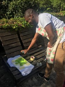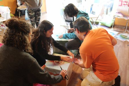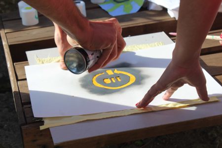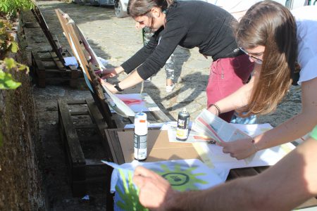 Esta oficina teve como objetivo dar a conhecer várias técnicas artesanais na área das artes plásticas, muito focado na reutilização e reciclagem de materiais de forma criativa. Os participantes foram desafiados a pensar numa forma gráfica que representasse o seu ODS, para depois aplicar numa t-shirt, utilizando a técnica do stencil. Além das t-shirts, foram também estampados pedaços de pano, que foram depois colados a uma estrutura de cubos em forma de Totem. Foi assim construído o Totem dos ODS.