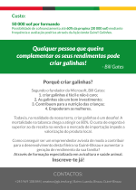 Qualquer pessoa que queira complementar os seus rendimentos pode criar galinhas! Porquê criar galinhas? Segundo o fundador da Microsoft, Bill Gates: 1) criar galinhas é fácil e não é caro; 2) as galinhas são um bom investimento; 3. contribuem para a nutrição das crianças; 4) empoderam as mulheres.[1]