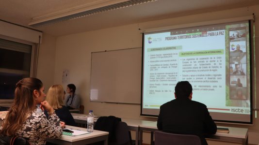 La clase fue impartida presencialmente por el profesor Paulo Pedroso, profesor del Departamento de Ciencia Política y Políticas Públicas del ISCTE, con intervenciones de Carolina Quina, Administradora Ejecutiva del IMVF, y con la participación vía Zoom, desde Colombia, del Brigadier General César Augusto Parra, ex comandante de la Sexta División del Ejército Colombiano en la región del Amazonas (Amazonia, Caquetá y Putumayo), Miguel Ángel Gómez, Subdirector Estratégico de la Red Adelco (Red Nacional de Agencias de Desarrollo Local de Colombia), entidad que colaboró en la implementación del proyecto desde el primer momento, Alfonso Henríquez, coordinador local del proyecto, y Federico Montes (Diego Ferney Tovar), uno de los firmantes del Acuerdo de Paz y ex guerrillero de las FARC.