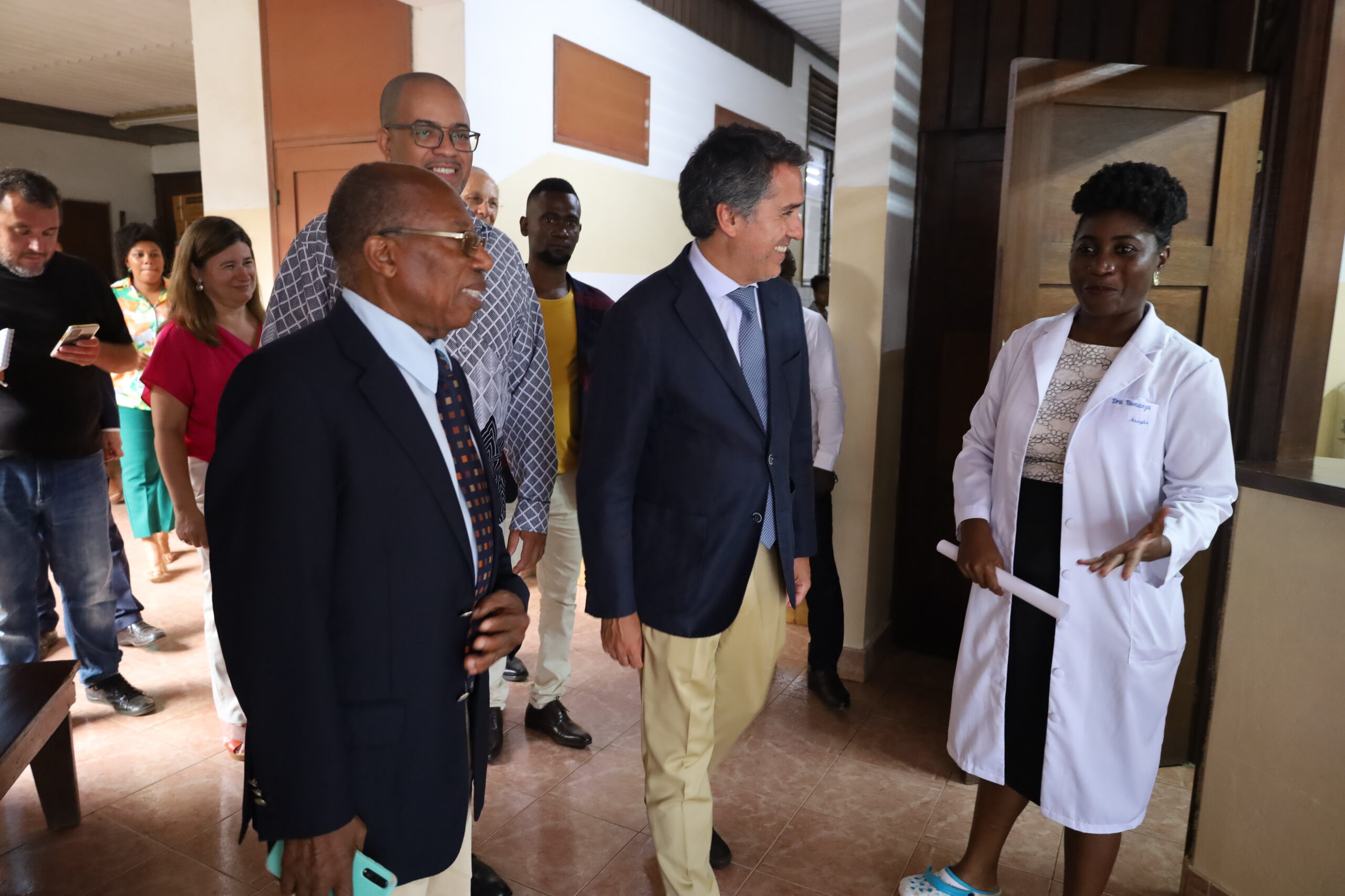 A visita do Secretário de Estado dos Negócios Estrageiros e Cooperação de Portugal, Dr. Francisco André, ao Centro Policlínico de Água Grande e ao Centro Materno-Infantil foi acompanhada pelo Ministro da Saúde, Trabalho e Assuntos Sociais de São Tomé e Príncipe, Dr. Célsio Junqueira, pela Presidente do Camões, I.P., Dra. Ana Paula Fernandes, pelo Embaixador de Portugal em São Tomé e Príncipe, Dr. Rui Carmo, pelo Administrador Executivo do IMVF, Dr. Ahmed Zaky e pelo Representante do IMVF/AMVF em São Tomé e Príncipe, Dr. António Lima.