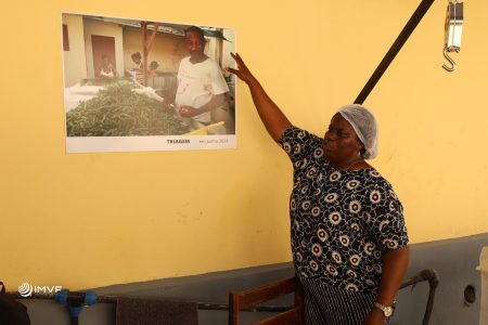 No âmbito das subvenções às associações de produtores filiadas numa cooperativa agrícola de uma cultura de exportação, a comitiva visitou a obra de melhoramento do Centro de Processamento de Cacau da Associação “Grupo Crescente” dos Produtores de Cacau de Qualidade de Mestre António. Esta associação, filiada na Cooperativa de Exportação de Cacau de Qualidade (CECAQ-11), foi uma das 25 associações beneficiárias destas subvenções (cujo valor global disponível foi de 250.000,00 €). Com um investimento de cerca 10.000,00 € foi possível melhorar as infraestruturas de processamento do cacau desta associação, nomeadamente ao nível da fermentação, secagem e armazenamento, concretamente através da construção de uma vedação do secador melhorado (secador este melhorado com o apoio do PAFAE em 2022), de quatro caixas de fermentação e de um armazém. De salientar que a elaboração de todas as propostas apresentadas teve por base um modelo participativo (“Método Djuntu, método concebido pelo IMVF na Guiné-Bissau, no quadro do projeto Ianda Guiné Djuntu, financiado também pela UE, e agora aplicado com sucesso, em São Tomé e Principe), que envolveu os membros das associações na identificação das suas necessidades e na procura de soluções para a resolução dos seus problemas específicos. Em muitas associações, a produção das culturas ultrapassa a capacidade física de processamento dos produtos, pelo que a melhoria das infraestruturas permite colmatar as atuais condições e melhorar a qualidade da produção e, consequentemente, aumentar o rendimento dos produtores.