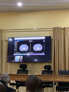 A delegação teve a oportunidade de contactar, in loco, com a Missão de Imagiologia liderada pela Dra. Celeste Alves, médica radiologista da Fundação Champalimaud, a trabalhar com a equipa guineense, encabeçada pelo Dr. Artur Semedo Insumbo, Diretor Clínico do HMP e responsável pelo Serviço de Imagiologia. A delegação assistiu a uma consulta de telemedicina (na qual participou também, a partir de Lisboa, a Dra. Clara Aleluia, da Fundação Champalimaud), ao diagnóstico de dois casos clínicos graves – um caso de colangiocarcinoma e um caso de cancro da mama -, e à discussão sobre as opções terapêuticas a seguir.