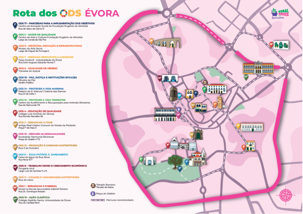 A Rota dos ODS foi concebida e dinamizada pelos alunos do 2.º ano do curso de Apoio Psicossocial da Escola Secundária Severim de Faria, com o acompanhamento da Equipa Técnica do Centro de Inovação Social, da Fundação Eugénio de Almeida, constituindo um exercício de cidadania ativa e participação juvenil na comunidade. Esta atividade alia o conhecimento sobre os ODS e a Agenda 2030 com a história, o património e os monumentos da cidade de Évora, promovendo a reflexão sobre os desafios globais a partir de uma perspetiva local. Num momento em que a cidade se prepara para assumir, em 2027, o título de Capital Europeia da Cultura, esta iniciativa reforça o papel de Évora como espaço de cidadania, participação e inclusão.